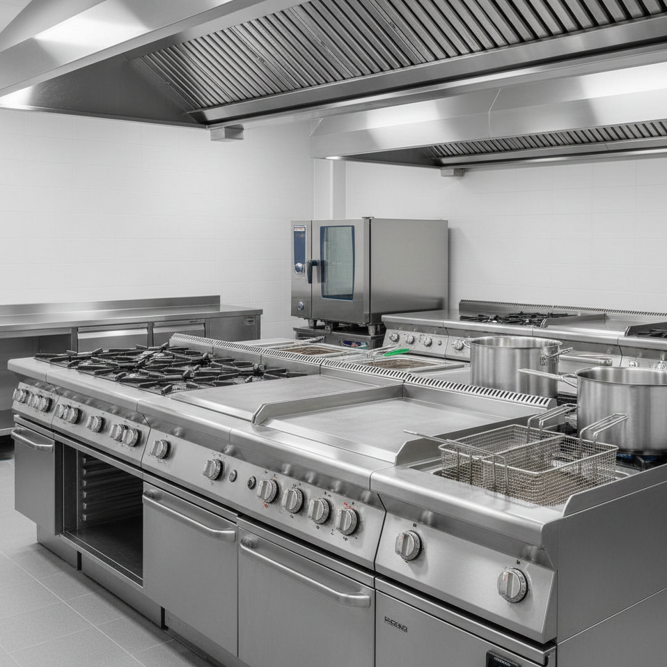 Attrezzature di cottura professionali per la ristorazione,cucine professionali a gas ed elettriche in acciaio inox,fry top, piastre, friggitrici e cuocipasta professionali,disposte in modo ordinato e coordinato,ambiente cucina professionale pulito e moderno,superfici in acciaio inox ben illuminate,luce neutra e diffusa, atmosfera tecnica e professionale,fotografia realistica ad alta qualità per sito e-commerce Ho.Re.Ca.,nessuna persona presente, sfondo ordinato e non distraenteprofessionali selezionate per l’utilizzo nel settore Ho.Re.Ca.Soluzioni pensate per garantire affidabilità, funzionalità e continuità operativanelle cucine professionali, ideali per ristoranti, gastronomie e laboratori alimentari.