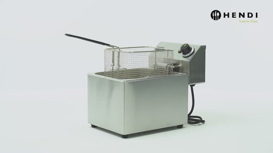 Friggitrice HENDI Kitchen Line 8 litri, potenza 3500W, alimentazione 230V. Struttura e vasca in acciaio con contenitore removibile per una pulizia semplice. Elemento riscaldante estraibile con spegnimento automatico, temperatura regolabile fino a 190°C e zona fredda per preservare l’olio. Dotata di termostato di sicurezza, spia di controllo, cestello con manico isolato e coperchio.